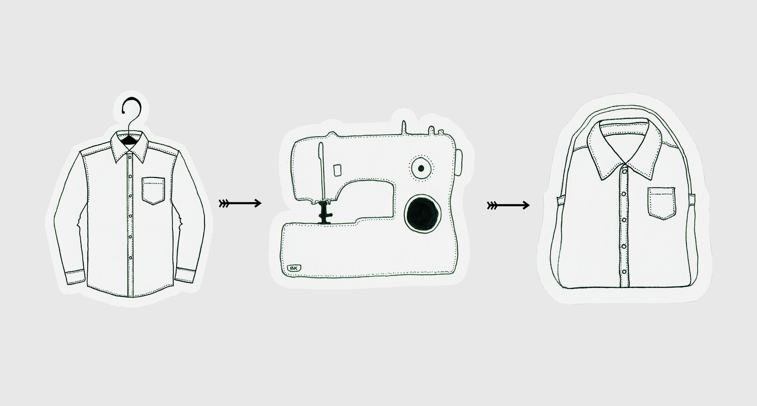 Una mochila gigante de mezclilla sirve de recipiente para los clientes que quieran reciclar ropa. Figuras geométricas hechas de cartón funcionan como display para las hermosas mochilas BeeKeeper, cada una es única, hechas con telas de camisas con terminaciones de alta calidad y llenas de detalles. Mochilas upcycled de distintos tamaños, así que marido y niños pueden tener una.