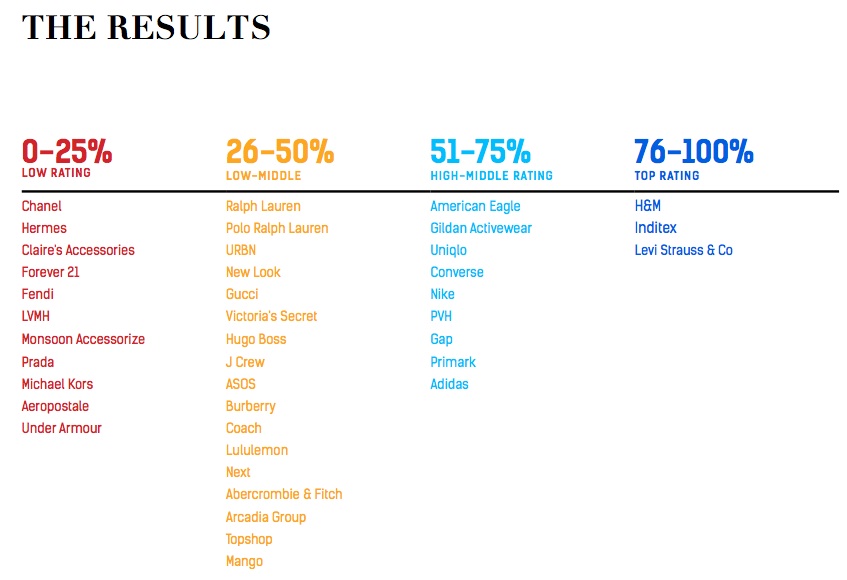 En esta primera versión se tomó un universo de 40 grandes marcas cuyo puntaje máximo era 100%. Sin embargo, el promedio de las encuestadas fue apenas 42%. De hecho la de mayor puntaje fue Levi Strauss & Co que obtuvo 77%, seguidas por H&M, Inditex (Zara, Pull & Bear, Bershka, etc.), adidas y Primark.