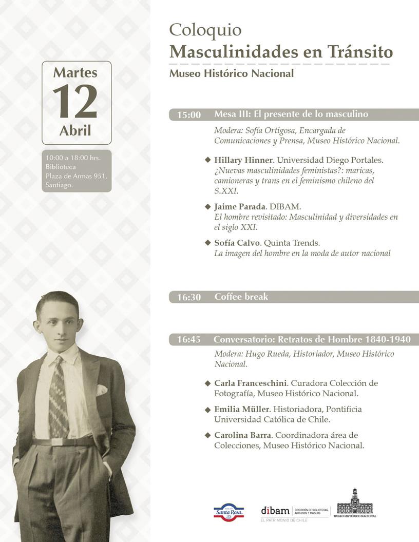 "El principal motivo del coloquio es realizar una actividad de cierre de la exhibición temporal del Museo Histórico ' Hombres entre dos siglos: XIX-XX '. La exposición intenta, a través de objetos e imágenes, dar cuenta de la condición cultural de lo masculino y, por lo tanto, sometible a tránsitos en su uso y comprensión social. De ahí el título de nuestro coloquio 'Masculinidades en tránsito', pues queremos, desde otra perspectiva, dar cuenta de las transformaciones que ha sufrido (y continúa sufriendo) la noción de lo masculino en la sociedad chilena.