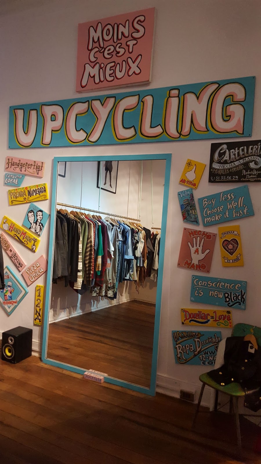 Sin duda, el espacio captura todo el espíritu Doceñada mediante entretenidas instalaciones para el probador, un gran y lúdico espejo, además de carteles que proclaman los 12 valores de la etiqueta: upcycling, pieza única, transformación, original, responsable, artesanal, deconstrucción, a mano y a máquina, consciente, numerada, amor y doceñar.