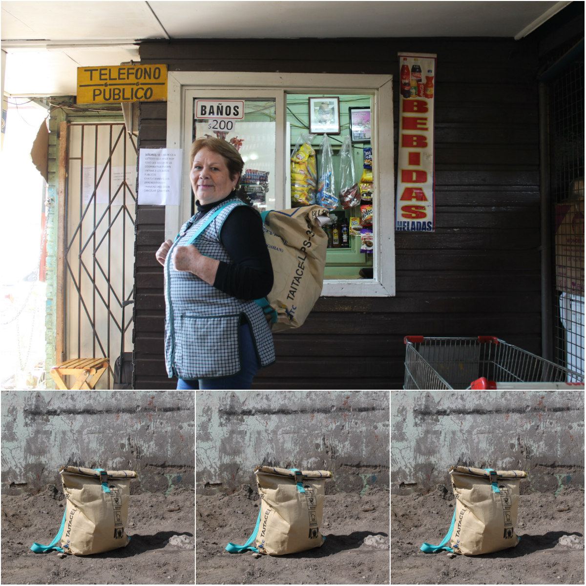 "Elegimos un material que es muy popular y que está presente en la mayoría de los mercados a lo largo de Chile. Debido a sus cualidades, el chileno ha sabido reutilizarlo para darle la clásica función de bolsa de feria construida con sacos de harina o azúcar, nosotros observamos esto y propusimos un bolso con lenguaje actual. Es cotidiano que como chilenos habitamos espacios, usamos objetos o lenguajes que nos identifican, solo faltaba observarlos desde otra posición para poder rescatarlos y designar nuevos usos".