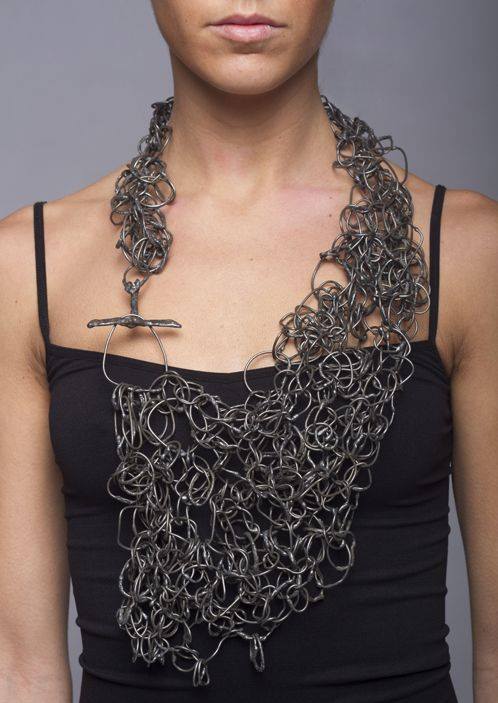 Nuevas formas en la técnica y la posibilidad de ocupar la cabeza en la que vendrá, después de seis piezas dedicado esmero el collar de Amor apareció para mi alivio y para el comienzo de los comienzos. Aleccionada por el mismo, aprendo que siempre hay otra colección, que a los tiempos se los disfruta, que las calmas son posibles y que siempre se trabaja para seguir desentrañando. El collar de Amor tiene un nuevo recorrido, un ritmo invariable y la flexibilidad de todos los materiales.