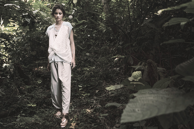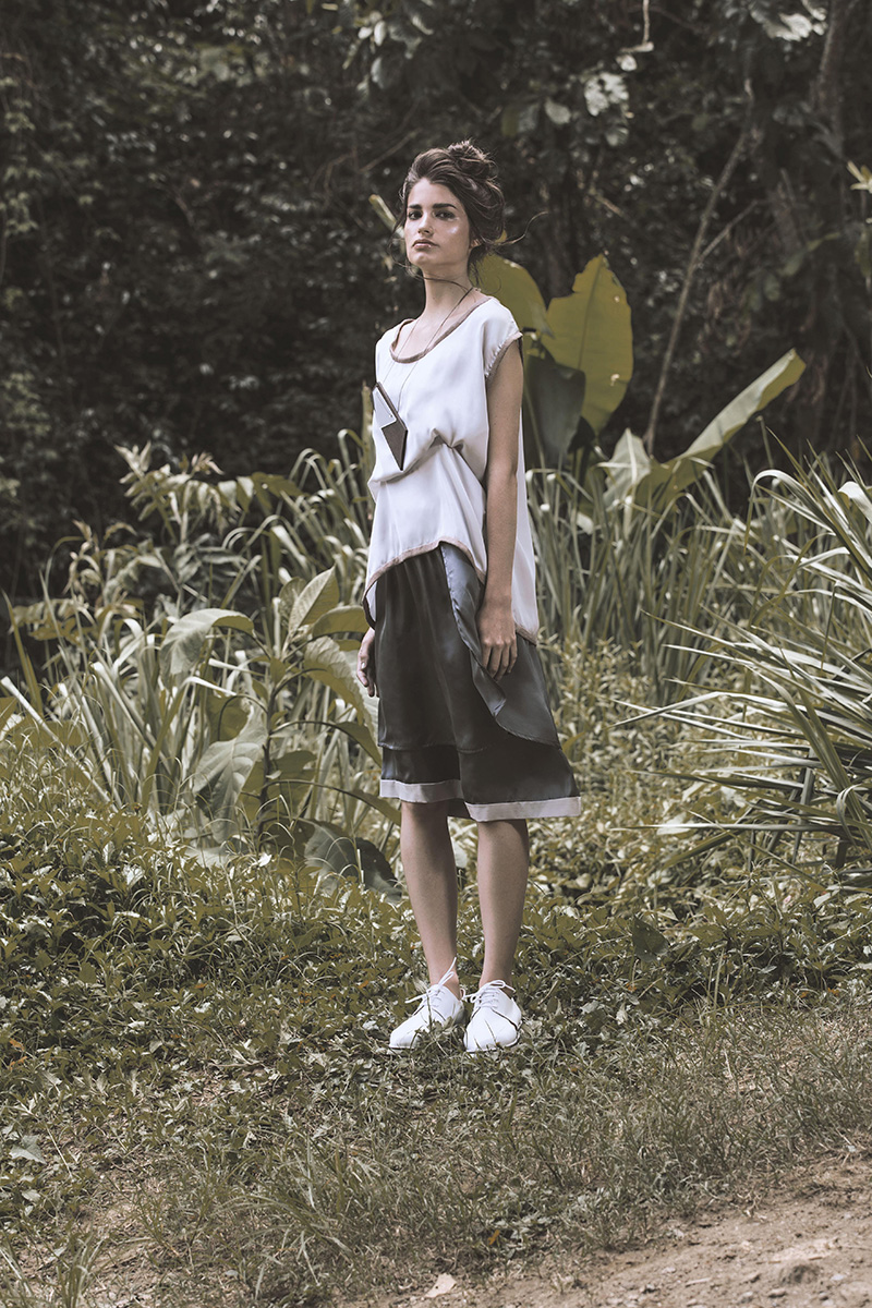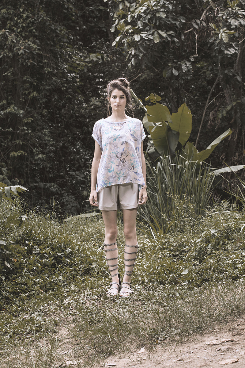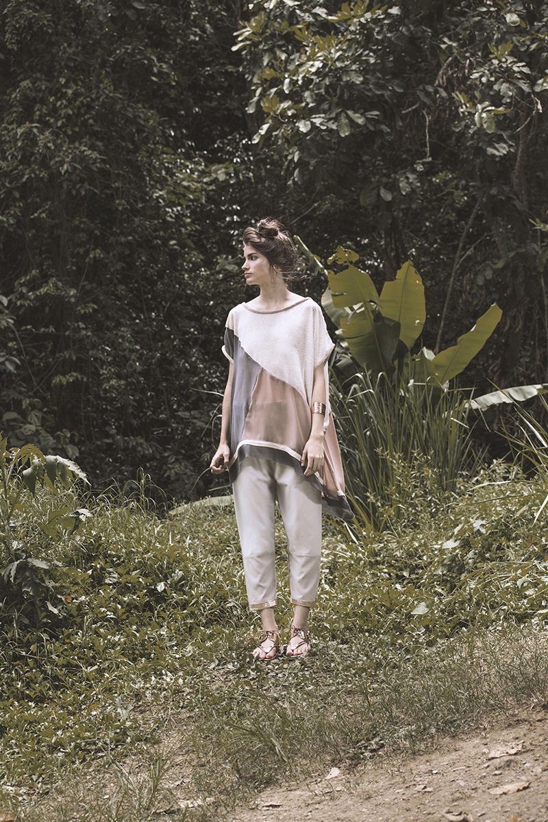 En este sentido Laili diseñó una colección pensada en esa aventurera que necesita moverse liviano, con poco equipaje. Para ello decantó por un fit holgado, con muchos cortes asimétricos, además de tonos que remiten a los paisajes de sus referencias cinematográficas, como el beige, marrón sepia, gris y rosado, además de dos tipos de estampados, uno de flores en tonos coral y otro de manchas en tonos beiges.