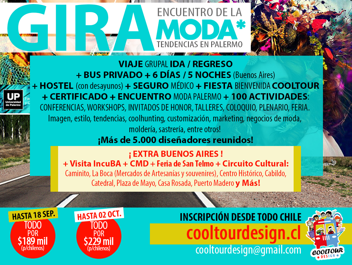 , Buenos Aires, que te permitirá hacer una primera parada en Mendoza, donde podrás compartir con destacados diseñadores locales para terminar en la capital con un cronograma de actividades que incluyen workshops, conferencias, paseos y mucho más. Lo mejor, a un precio demasiado conveniente. Acá te dejo los detalles para que te sumes.Gira al Encuentro de la Moda en Palermo por CoolTour Design