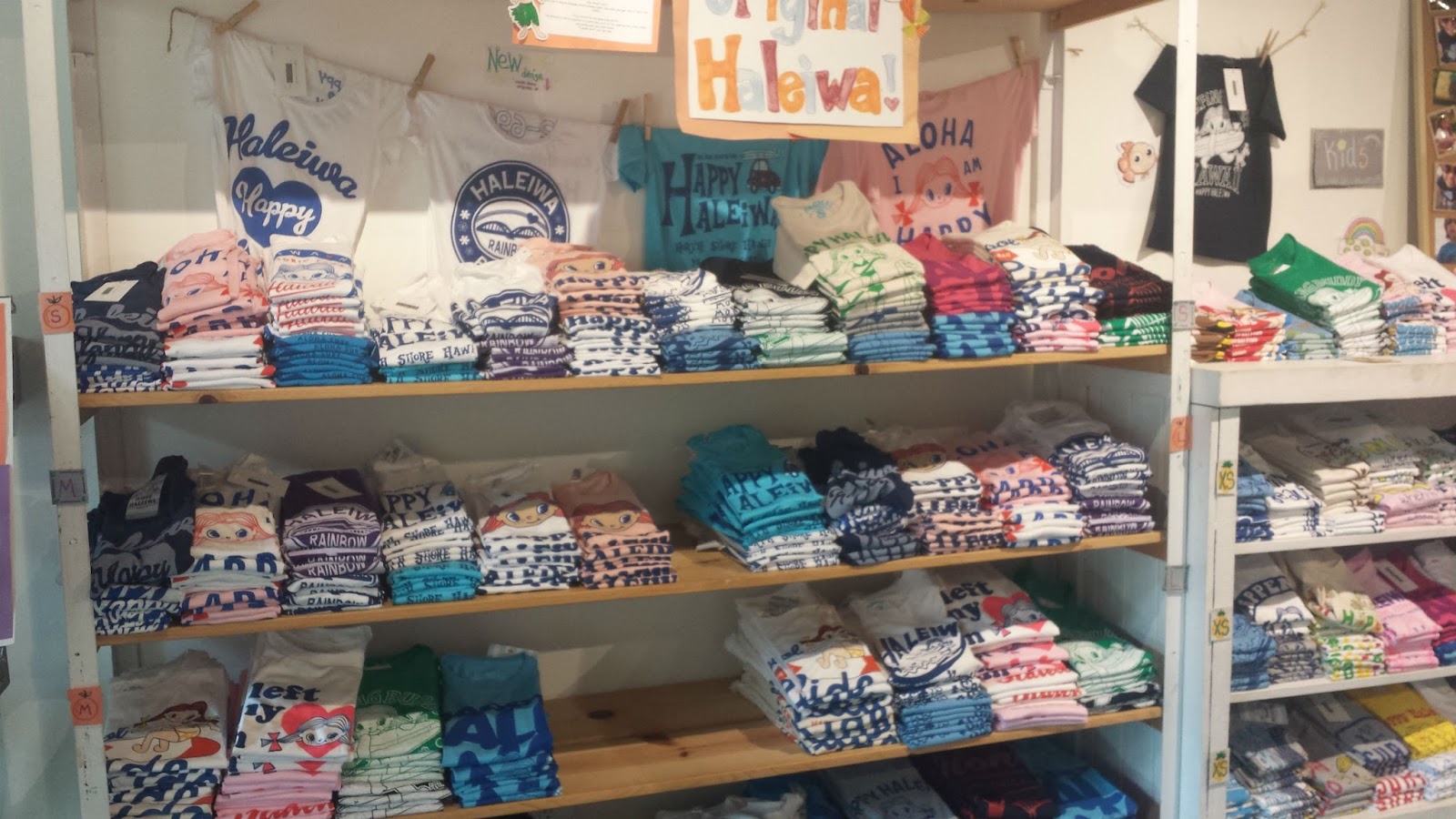 El primer aspecto que llama la atención al entrar a la tienda de Happy Haleiwa en Haleiwa (66-145 Kamehameha Hwy, #2-2), además de su estética, es lo explícito de su público objetivo principal: los japoneses. ¿En qué se nota aquello? En que en la hay información de la marca en ese idioma, una de sus dependientes con suerte habla inglés (pero sí japonés) y su sitio web está completamente en japonés (buscando más info de la marca lo noté). De hecho hay una sección de "clases de inglés" para que se hagan una idea, pero no una versión en ese idioma.