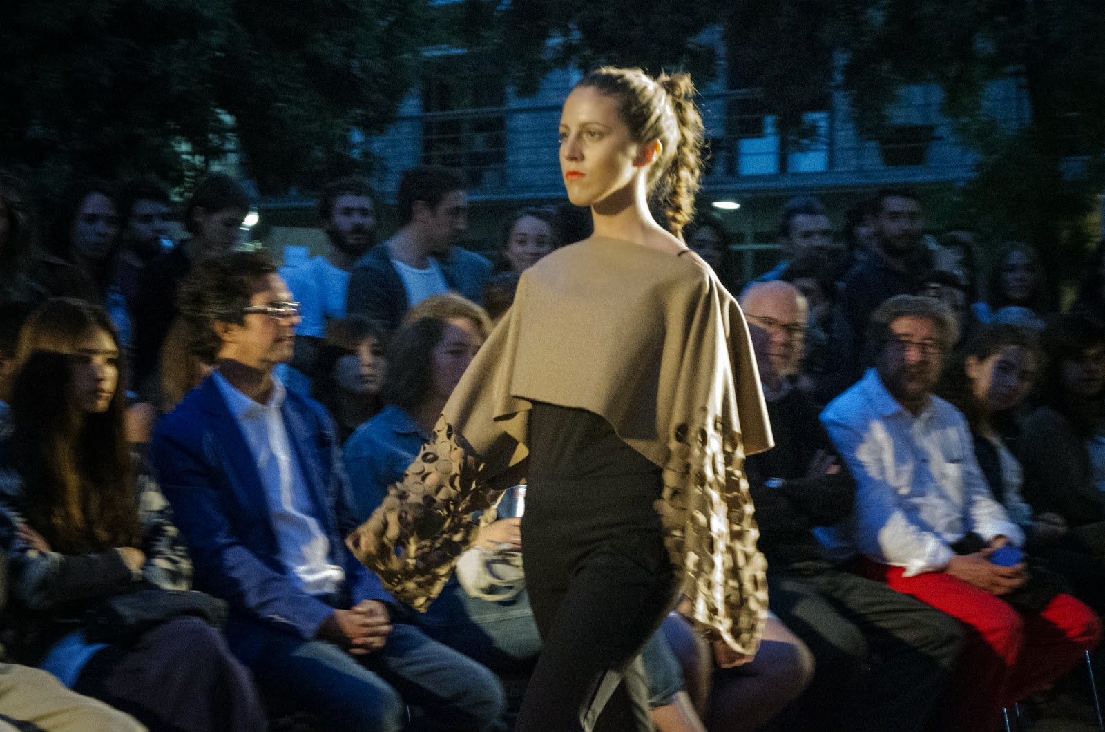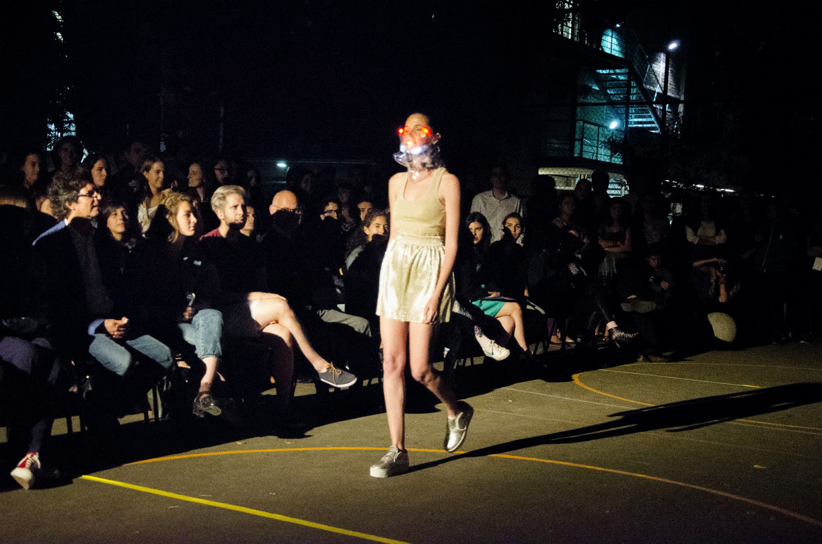 Fue muy interesante ver los distintos tipos de experimentación que los alumnos llevaron a acabo, intervenciones en tela, accesorios para los zapatos de taco alto, accesorios con luces, etc. Todo presentado aprovechando el espacio físico que rodeaba la cancha.