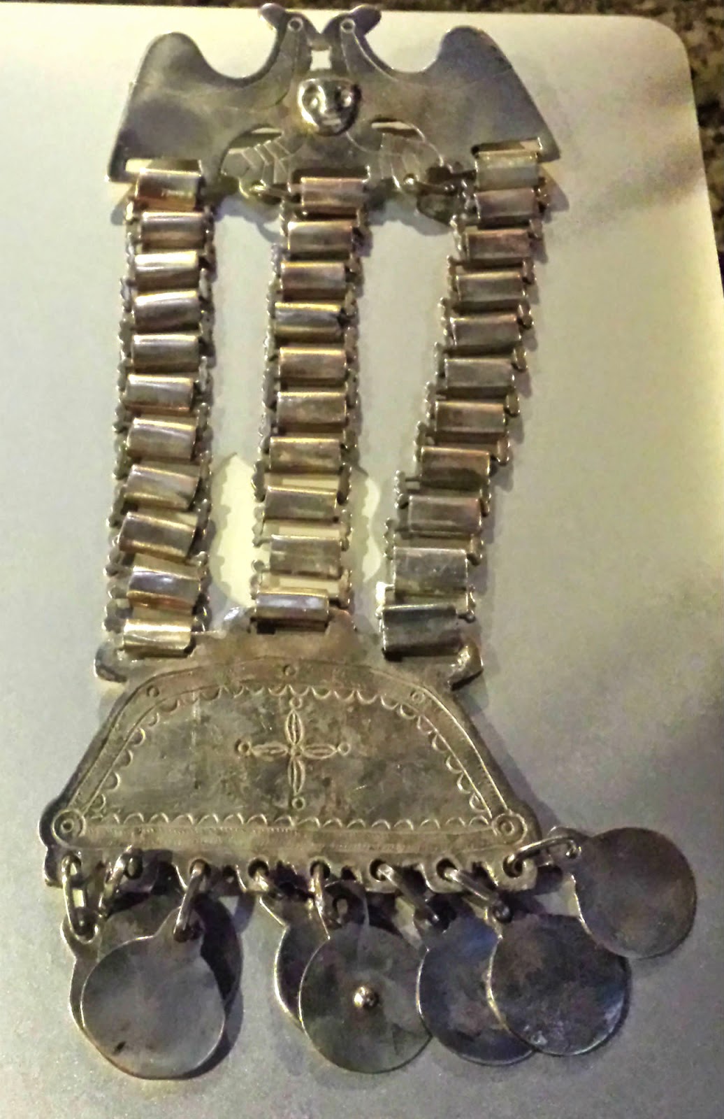Trapelacucha en plata, cuyos significado habla no sólo de la naturaleza, sino también del linaje familiar de quien la portaEste aspecto me llevó a pensar que existen dos caminos para la creación de moda inspirada en lo ancestral: el literal, que utiliza sin mayores cambios tanto las técnicas como simbologías de la etnia; y el interpretativo, que sin perder de vista la tradición logra reintepretar lo literal y le da un giro moderno y vanguardista. Sin duda, este último aspecto es el que me parece más atractivo, porque supone acercarse a la fuente, investigar e internarse más allá del museo en estas culturas donde lo oral es la base de la transmisión del conocimiento.