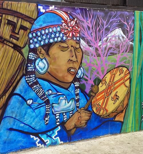 Mural en calle Higueras, Cerro Alegre, ValparaísoNo obstante, la vida siempre nos lleva a los lugares apropiados cuando tenemos la capacidad de recibir sus mensajes menos literalmente. Eso me pasó luego de visitar la Ruka Kimun de la Comunidad Makewe zanja en las cercanías de Temuco, donde no sólo pude aprender más sobre la cultura mapuche, sino también de su comovisión / filosofía de vida, que se imprime con intensidad en todas sus expresiones manuales desde lo textil a la joyería.