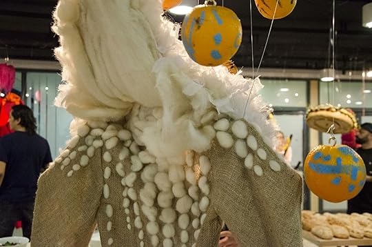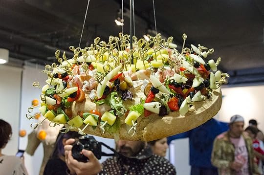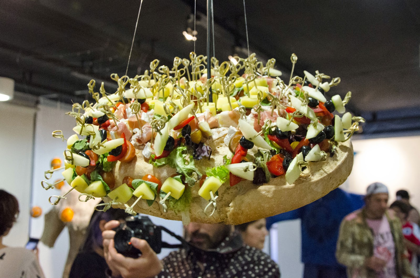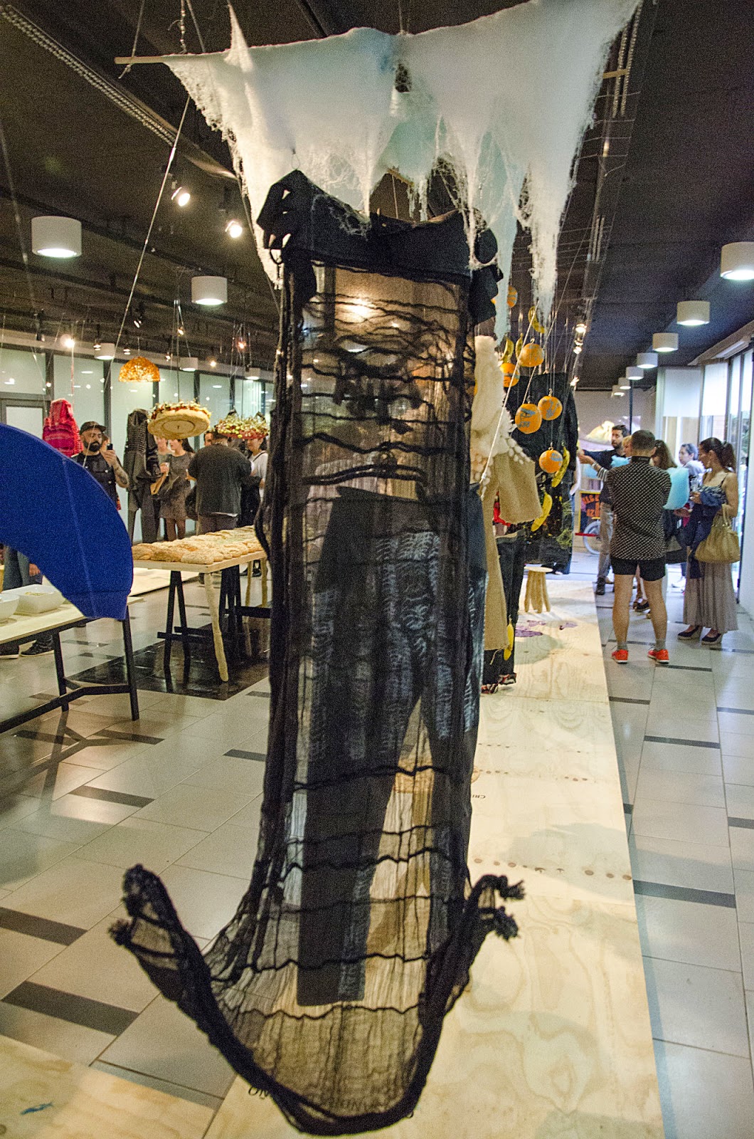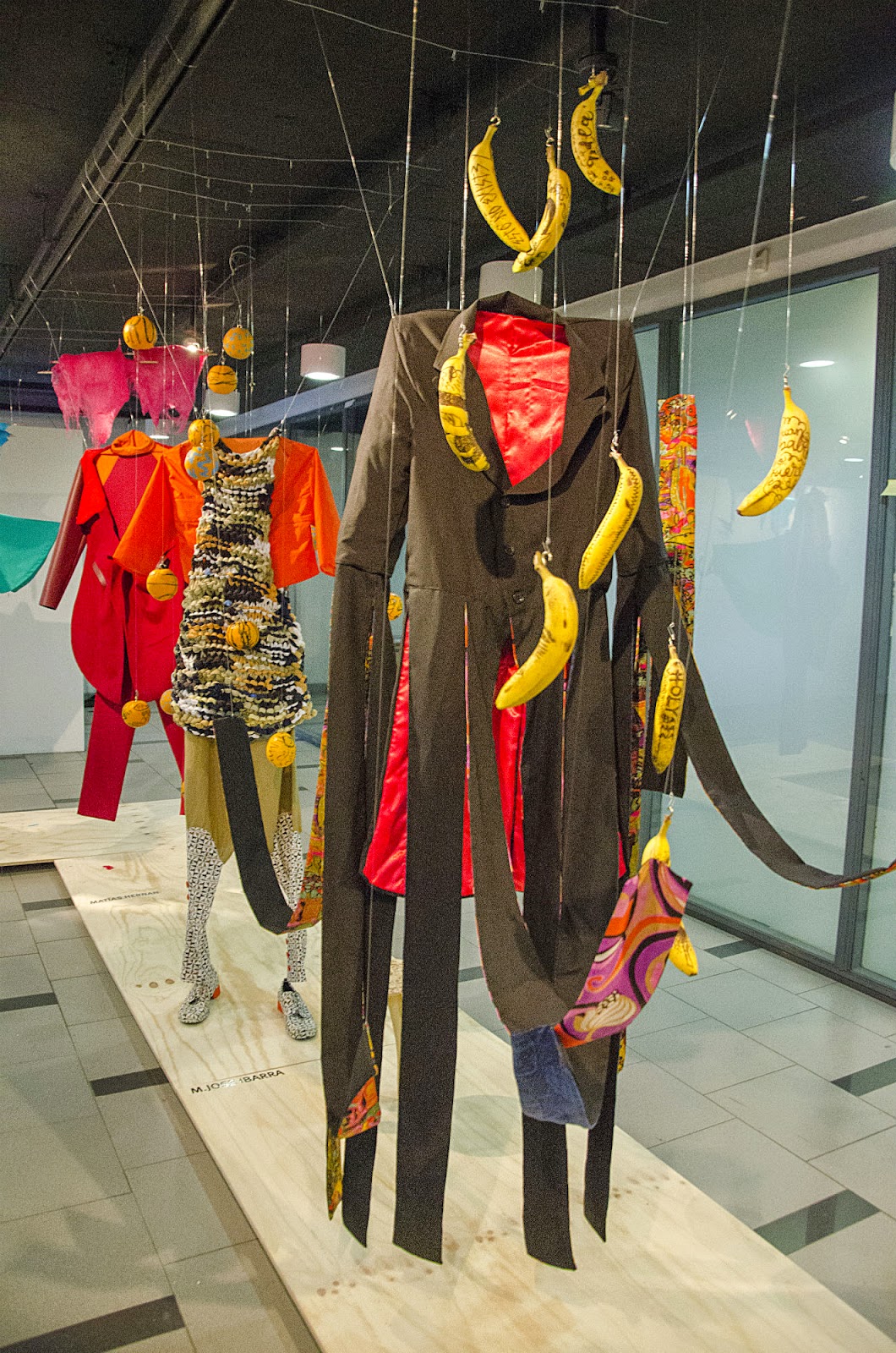 Lo de “consumir” se presentaba como algo literal: las prendas estaban rodeadas de alimentos, había un mesón de panes ordenados, pizzas colgantes, fuentes de humus, etc. La presentación nos pareció muy interesante. El montaje de las prendas (vinculados a diversos creadores de esta casa de estudios) calzaba perfecto con la ambientación culinaria