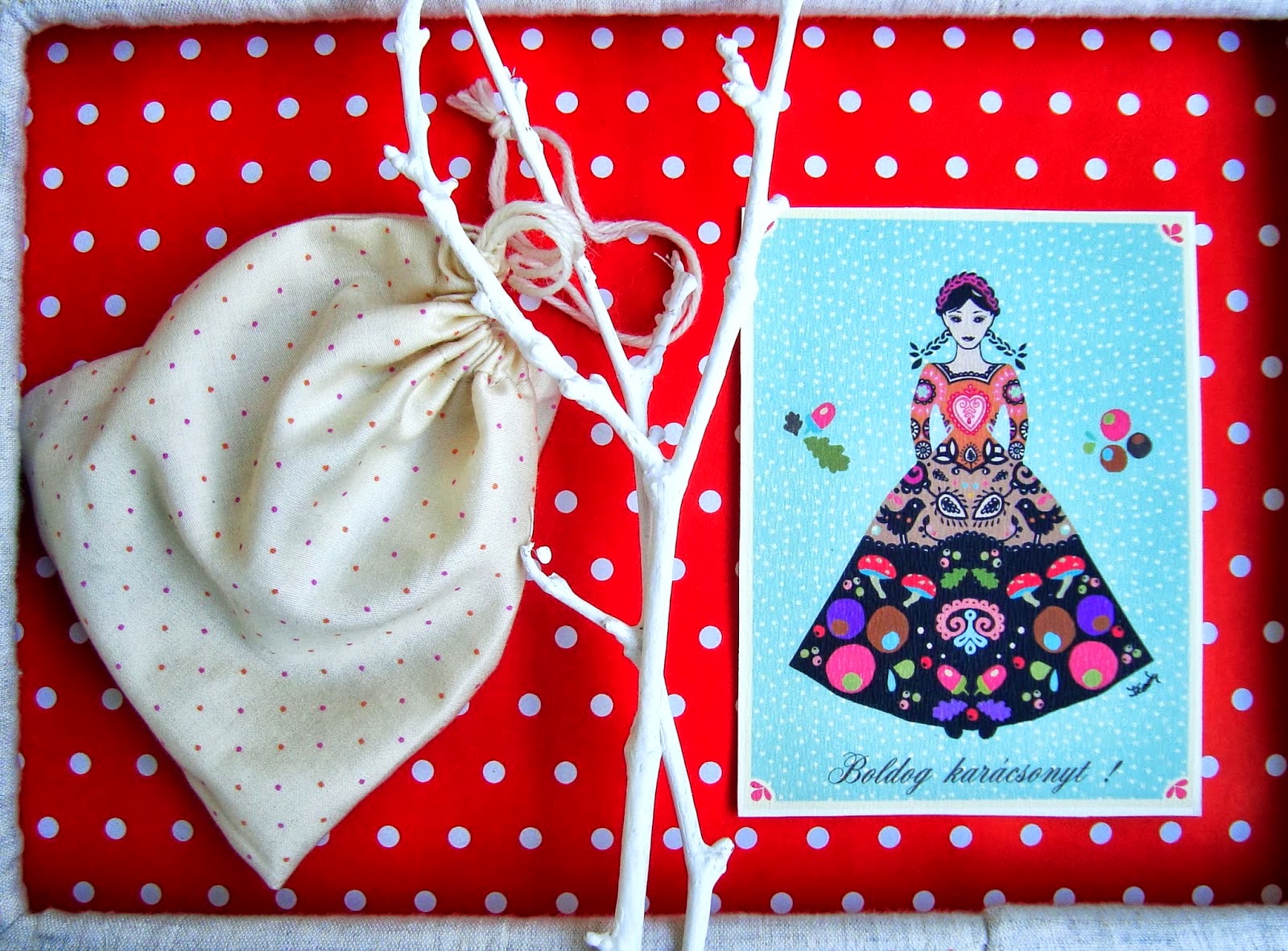 Un ejemplo del estilo de ilustraciones de Tatai, que plasma en diversos productosAdemás me llevé una postal de la ilustradora Feyér Zsuzsa , que resignificaba un personaje clásico del folclore húngaro a través de la intervención de su vestuario y la creación de un nuevo mundo.