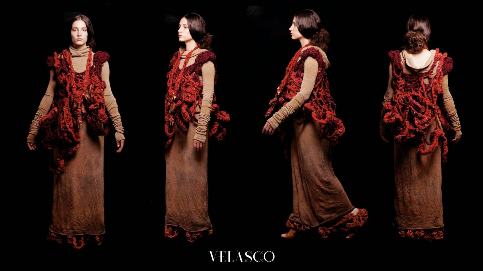 “Velasco desarrolla su etiqueta bajo lineamientos de complejidad visual, que se definen en el desarrollo de texturas nacidas del tacto directo con los tejidos. De carácter rústico y femenino a la vez, Velasco se nutre de imágenes relacionadas a su tierra y el mundo que la rodea, sonidos y aromas que sabe propios, integrándolos de manera conceptual o simbólica en sus prendas, utilizando materias primas nobles.