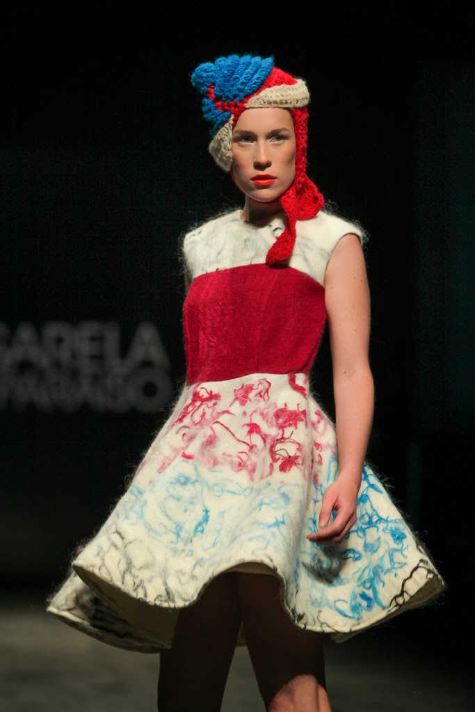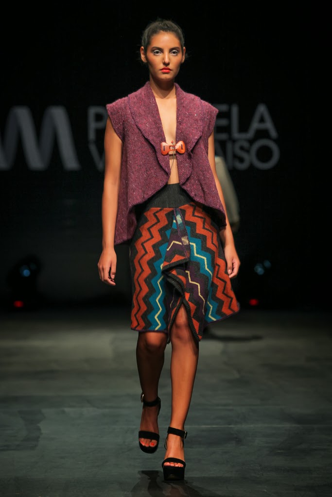 Pasarela Valparaíso 2014 fue cerrado con la colección de Pitti Palacios , quien se salió de su zona de confort y se embarcó en un trabajo de fieltro traducido en unas bellas faldas con aplicaciones de lanas, junto con vestidos; y unos gorros de invierno que más parecían tocados, que me encantaron (yo quiero uno!). Creo que fue un acierto y le abre un nuevo horizonte en términos de siluetas y público.