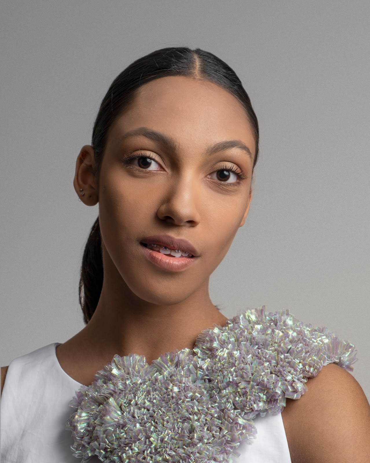 Créditos producciónModelo: Rosa Puga Larraín / Fotografía: Lorena Oro / Aros: Casa Kiro / Broche de flor: Sebastian Marino
