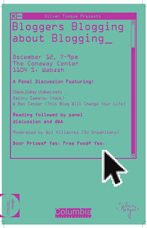 Bloggers. Blogging. Panel. Zulkey. Samarov. Tanzer. Villacres. Silver Tongue Reading Series. Columbia College. Tomorrow. Yes.