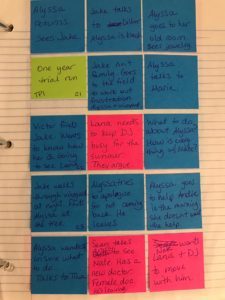 Sometimes I use sticky notes. That’s what I’ve been doing with Raise A Glass books (this is from Never A Bridesmaid, Always A Bride). Because they are longer, contain multiple story lines, and have to move a lot of pieces, I use sticky notes. The one downside is they don’t have space for a lot of detail.