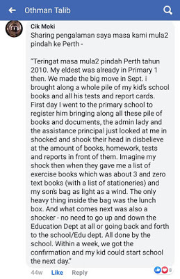 Aku dah lama citer... biar org lain plak citer... school is not about textbook .. and textbook.. and lot of exercise books... naknya baru Tahap 1 primary... School is about learning and even better without textbooks...