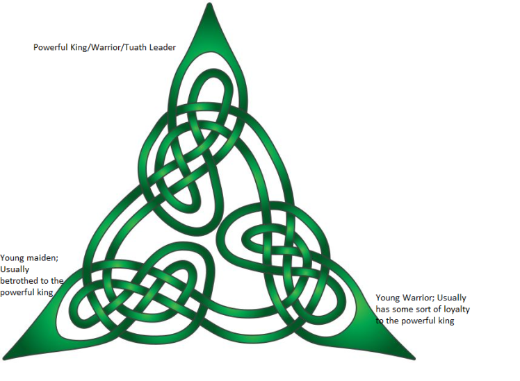 The Celtic love triangle is characterized by three main characters. The first is the old man, who usually has a great amount of power. The second, young, beautiful maiden, is always featured as the individual betrothed to the old man. The third character is the young man/warrior/male figure, whom the maiden eventually falls in love with or seduces.