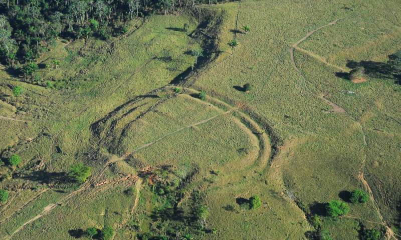 Jenny WatlingThe Amazonian rainforest was transformed over two thousand years ago by ancient people who built hundreds of large, mysterious earthworks. The ditched enclosures, in Acre state in the western Brazilian Amazon, were concealed for centuries by trees. Modern deforestation has allowed the discovery of more than 450 of these large geometrical geoglyphs.