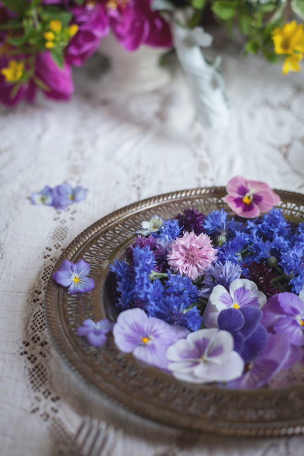 3/4 cup superfine sugar1 egg white, lightly whisked2 dozen organic pansies2 dozen organic violas6 egg whites2 cups granulated sugar1 teaspoon corn starch1/2 teaspoon vanilla extractpinch of salt2 cups whipped creampastry brushparchment paperpastry bag fitted with large open-star tip (optional)