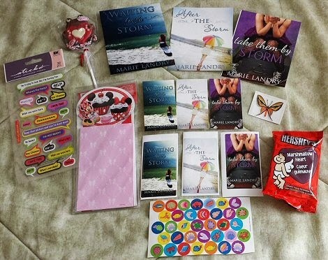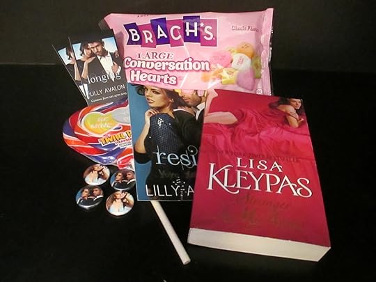 Plush with candy, $15 iTunes gift card, AYTA and OSA swagAngel Island swag (postcards, mini bookmarks, stickers), chocolate, Minnie Mouse memo pad, various stickersSeduced by a Stranger by Lisa Kleypas, candy, book swag (including buttons!)Autumn notebook & bag of chocolates & handmade hemp bracelet & book swag