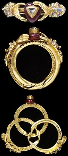 Los anillos han sido objeto de intercambio entre parejas desde el principio de nuestra era. Cuando ese anillo constituye además un símbolo de amor, suele incluir una inscripción o su diseño pasa a ser más elaborado. Uno de los diseños más populares en la Edad Media era el que representaba dos manos unidas y que recibió el nombre de fede (italiano del vocablo “fe”). Más adelante, y como anillo de matrimonio, se intercaló un corazón entre las manos como símbolo de la indisolubilidad de la unión por amor.Las habilidades técnicas de los orfebres del Renacimiento produjeron un nuevo estilo de anillo derivado del fede: el gimmel (palabra que proviene del latín "gemmelli", que significa “gemelos”). El gimmel lleva dos aros, a veces tres, que se despliegan en abanico desde el centro de la base. Al cerrarse, los aros se unen tan perfectamente que solo se ve un único anillo. Esta alusión simbólica al matrimonio era realzada mediante una inscripción grabada en el aro y extraída de la ceremonia nupcial: «Lo que Dios ha unido que no lo separe el hombre». Un ejemplo real lo tenemos en Martín Lutero, que llevó un gimmel con esa inscripción el día que contrajo matrimonio con Catherine Bora en 1525.El gimmel suele ser de oro, con un rubí y un diamante en el aro central, como símbolo del amor y de lo perdurable respectivamente, y unas manos talladas en los dos aros externos que, al cerrarse, parece que sujeten las gemas centrales, como símbolo de que dos personas se unen en una sola. Muy pocos orfebres se atrevieron a realizar tan sofisticadas sortijas. Cuando descubrí la de la fotografía que veis en este post, mientras buscaba documentación sobre joyería del siglo XVII para la novela La joya de mi deseo, el anillo me atrapó de tal modo que quise incluirlo en alguna de mis historias. En la que estaba escribiendo no tenía cabida, pues ya había otra, la Perla Peregrina, que tenía un papel muy importante (otro día os hablaré de ella), así que la guardé para la siguiente. En La diosa de mi tormento, un anillo gemelo como este, realizado en Europa entre 1600 y 1650, será la clave para descubrir cierto secreto del pasado del protagonista masculino, Julián. Foto: procedente de travellinganachronism.tumbrl.com.