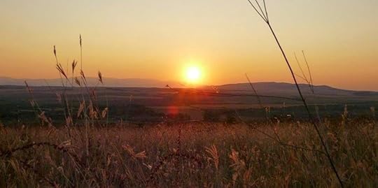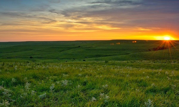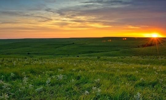 The sward is a carpet of tall, untamed grasses, colored with the yellows, whites and purples of wild flowers undulating in the breeze, making a soft swishing sound. The aromas of the coarse earth, of the raw vegetation, fill their noses when they breathe deeply. The field sweeps to the left and right, south and north, for 1,500 feet to meet a wide glimmering river that looks alive. Shimmering rays of the setting sun scatter across its surface. It bends back and forth several times before disappearing around a neighboring hill that is covered with forest. The bluffs they are on curves north like a bowl for half a mile, where it has been gouged by another river that is narrower and in more of a hurry. The waters meet to form a deep swirling pool before the flow continues south, eventually spilling into the Mississippi. To their left, the rise tapers to the tree-lined river for almost the same distance. The hills around them are varied in both height and covering. Many of the southern ones are barren of growth, composed of brown and reddish dirt exposed on cliffs that the water has created by its passage. Jagged mountain peaks are visible a hundred miles in the distance. The northern portion is mostly knolls capped with coniferous trees. The deep green of the forest facing them is as dark as their elongated shadows. Save for the sun, the sky is empty. The blue is rich as a new ribbon, just turning pink on the horizon. Small birds weave among the grasses looking for insects or seeds, calling or complaining. Two deer stand at the junction of the rivers; they were drinking but now stare at the family, bewildered by the odd interruption, not knowing they will need to fear the strange animals they see. A large bird circles above the tree line on open wings, looking for prey.