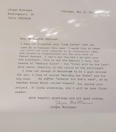 I asked Moltmann two questions after profusely thanking him for his theological work. First, I asked about the current president of the United States, Donald Trump. Like many other Americans I am profoundly disturbed with the president; I find many of his policies to be the very antithesis of the way of Jesus Christ. It shouldn’t be a surprise to those familiar with Moltmann to learn he also responded with sadness about our president, writing, “I can’t say how sad I am with your new president.” Second, I asked Moltmann if he has any comments about Samuel Beckett, and I mentioned my interest in placing his theology into dialogue with Beckett’s literary project. To this Moltmann said he is mostly unfamiliar with Beckett, but encouraged me to pursue the project.