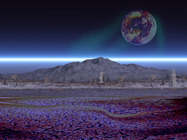 “Tras un enorme árbol divisó lo que parecían los restos de un muro, perteneciente a un imponente edificio en ruinas. Se acercó y observó que aquella parte del bosque estaba plagada de restos de formidables edificaciones, algunas tan titánicas que llegaban a sobrepasar a las gigantescas coníferas. Eran edificaciones que en su origen debieron ser rectas, aunque ahora la mayoría estaban cubiertas de vegetación, corroídas o hechas pedazos. Algunas estaban rotas y partidas como muñones de los que sobresalían estructuras de metal oxidado.