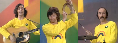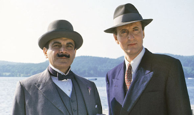 Hugh Fraser, the actor who so definitively portrays Captain Hastings in David Suchet's ITV Poirot, and is a superb narrator for many Agatha Christie audiobooks; was a musician in younger days, and played jazzy flute - and guitar (below) - on the theme tune of TV's Rainbow programme, for pre-school kids in the 1970s.