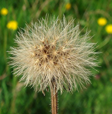 I took a slight diversion to walk through the 30-40 acre urban field (Little Moor) that forms the densest Hawkbit concentration hereabouts; when I discovered that most of the bright yellow flowers I reported just a fortnight ago; have turned into mini- dandelion-clock-style seed heads (each a little less than half the diameter of a dandelion-clock).