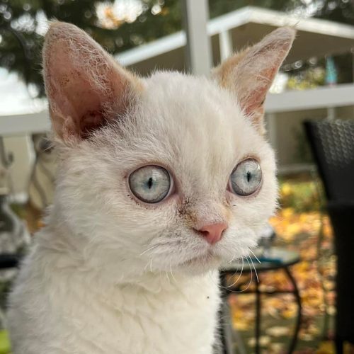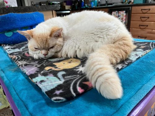 Otis is a purebred flame point Selkirk Rex kitten born June 13, 2021. The breed is known for its large size, plush curly fur and brittle whiskers. He was purchased from a breeder on 10/8/21 when he was about 4 months old. His then-owner noticed that he seemed lethargic upon arrival, and just 6 days later he was diagnosed with FIP (Feline Infectious Peritonitis).