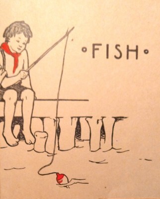 My grandmother must have liked fish, because “Recipes-My Friends and My Own” has several recipes written in her hand as well as a few clipped from various papers. She didn’t seem to care that she glued the columns on over the artwork. What may seem nostalgically artistic to us now was most certainly humdrum for her at the time. I tried to crop off the edge with the recipes and just focus on the picture but it came out wonky. Still, here it is.