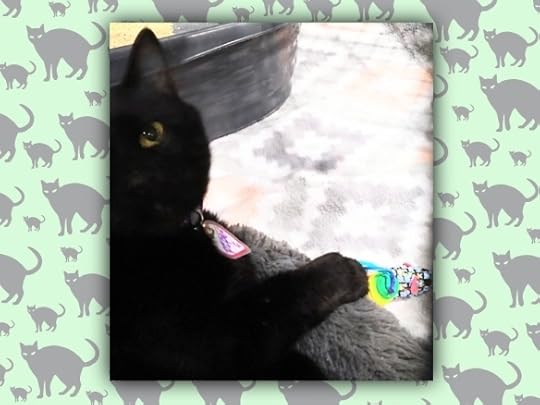 He finally came home to me on 11/12/21. He was just under 7 lbs. and had received treatment long enough that most of his FIP symptoms were gone by then. I was given a notebook in which to detail his treatment, symptoms, weight, food intake, litter box use, etc. on a daily basis. The ringworm treatment was even more of an issue for me than the FIP: he got daily oral antifungal meds, daily topical antifungal meds, and lime sulfur dips three times a week that left my entire house smelling like rotten eggs. But he was just a joy to be around. I hadn’t had an active kitten in years, so it was fun to sit in the room and play with him. When the weather was nice, I took him out to the catio, locking the other cats in the house to avoid contact.