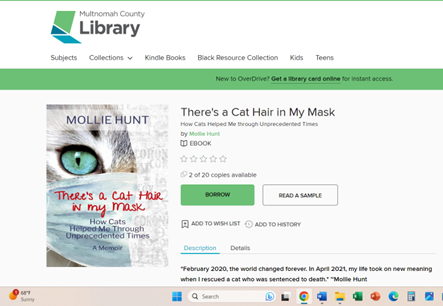 Have I told you how much I love libraries? My books are in a few of them, including my own Multnomah County Library, but now one more joins their ranks. I submitted, There’s a Cat Hair in My Mask: How Cats Helped Me through Unprecedented Times, to the Library Writers Project this year, and it was selected to be added to the library’s e-book collection. According to the e-Contact Librarian, my COVID memoir was “a standout.”