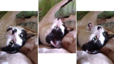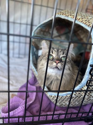 Foster cats Mia and Frankie are a bonded pair of very large cats who have only lived with one person for their whole lives. It took a bit of time to get them happy after suddenly being taken from their only home, but now they are doing fine. You’ll be able to adopt them soon!