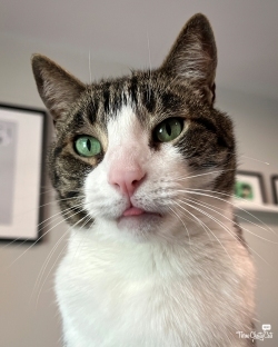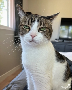 Harley is our most recent cat, another foster win, who we adopted in 2018. We estimate him to be no less than 16 years old now, and he’s our grumpy old man. Harley has chronic kidney disease but handles his meds and sub-q fluids like a champ. He bosses the other cats around and will demand they move if they’re in a spot he wants – and they immediately vacate the area. Harley is the boss, and he is known as our Hangry Curmudgeon.