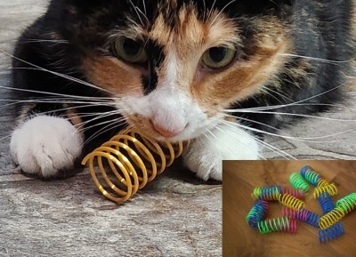 The product blurb says these spring toys are “…perfect for solo or interactive play for cats and kittens with vibrant colors designed to grab your cat’s attention for even more exciting play, helping to provide the daily exercise and mental stimulation cats need.” It seems to be true, because every cat I’ve seen offered them, both mine and other people’s, has taken to playing with them quickly and naturally. The only drawback is that they are so popular, the get batted under furniture, but it’s good exercise for us humans to bend down and get them out again.
