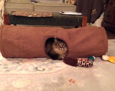 Clarence loves tunnels! Big or small, he spends time each day playing, running, and hiding in them. He will also sit like a king looking out the hole. But 1-year-old Clarence isn’t the only cat in our clowder to enjoy the tunnel. Melinko and foster cat Periwinkle can also be found racing in and out of this tunnel of kitty joy.