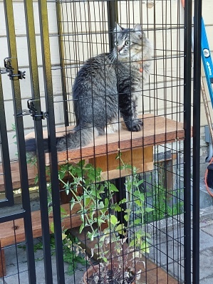 Clarence started out as a foster from OHS. He’d had his back leg amputated after a terrible accident that had healed badly. At first the kitten was quiet and sedate. Once we adopted him and he began to recover, he turned into a normal, energetic baby cat. He gets around as well as any cat and loves to chase the other cats. His favorite thing is to relax in the catio and watch the wildlife in our backyard.