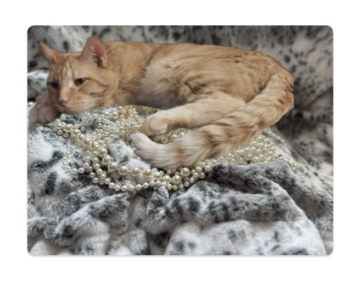 Melinko is the sweetest goofball! When our granddaughter could no longer care for him, we took him gladly. He is the perfect addition to the widespread age gap of the other two cats. His favorite thing, besides eating, is to chase his tail!