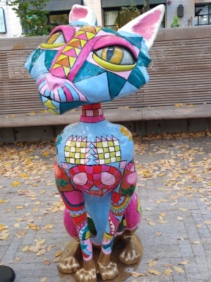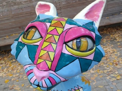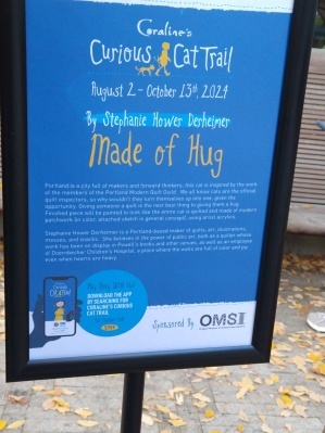 Quilts for a cause.In my 11th Crazy Cat Lady cozy mystery Crafty Cat, a central plotline is a group of quilters who are making cat-themed quilts to donate to a cat rescue charity auction. I’ve just discovered that here in Portland, there is a real quilt guild doing something different but similar. The Portland Modern Quilt Guild makes and donates quilts, some of which go to the Oregon Health & Science University’s pediatric Intensive Care Unit to make the rooms of longer-term patients feel less clinical. Recently one of their members, Stephanie Hower Derheimer, created a different kind of work, a one-of-a-kind hand-painted sculpture for Coraline’s Curious Cat Trail, an art project to benefit OHSU Doernbecher Children’s Hospital… and it’s all about cats!