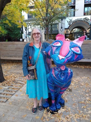 I caught the exhibit on its final weekend when all the cats were gathered in Director Square, downtown Portland. Though I missed seeking the cats in their natural habitat, it was nice to get to see them all at once. I had many favorites, but one of the most intriguing was Stephanie’s quilt-themed cat. At the time, I didn’t know the story behind her artwork, but when I found out, I knew I had to share it as one of my Crafty Cat launch features. Here were people doing a similar thing to the characters in my book, and though they weren’t quilting cat designs or donating to cat shelters, I would never have known about them had not it been for one very special cat.