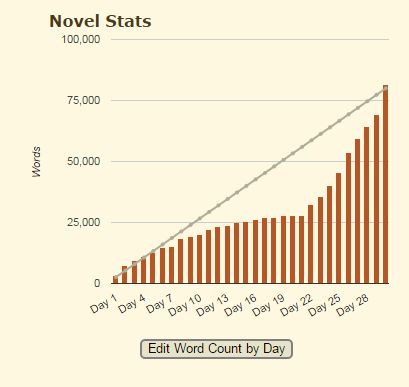 I am trashed. I wrote 43,000 words in the last eight days. The last day on that graph is an anomaly. The site knows I am in Australia but insisted that I had time left. Not sure where it thinks I am.According to my own word count at 11:30pm on the 30th, I was under by about 4k. Heavy sigh - only 4k?But on the 1st it said I still had ten hours to go (honestly nano where doyou think I am?) So - just to check - I collated and exported my scrivener file to Word; cut out the chapters that I had written before the camp started and voila! 81,427 in 30 days. Average of 2,700 per day.I am a winner.Yay. *throws confetti - waves pompoms*It was hard to check my word count as I was working on a section of a much, much larger project. And I am honest. I could have pasted it all in and said I finished 110k words. But that would be cheating.Plus scrivener counts any words I type in each day, so fact files and research info counted as part of my daily word count goal, but not part of my project word count, so my spreadsheets didn’t match. I can probably fix that somewhere but Scrivener is a very deep pool and I am still treading water on the surface of what it can do. Hey, I did well to NOT get all that stuff included in the final draft.And I kept writing things in sections that were not part of the Camp project. I also tend to edit; I can’t help myself. There is a kind of nanowrimo dread you feel when a word count goes backwards. So it is only in the last few desperate days that I stopped deleting things I am not sure about and just used strikethrough on them. They still count in the word total even if they really do get deleted later. But in 80k words, it’s not a big difference.But my cabin was a bit of a loss. We were put in a ‘cabin’; a little group of twelve so that we could cheer each other on. Four of us did that. The figures on the right are the cabin stats. Four members set their word counts and never wrote a single word or left a single message for others. ZERO. And one had a 100k target. Another wrote 1,700. So pretty much half the cabin were no-showers. There is an option to NOT be in a cabin, so I don’t understand why they did this. I get that disasters happen but surely you can see a problem early? So, as a cabin we hit a third of our target and failed miserably.You know me, I tried to help people. But I know me, too. I was right about tricking my brain into hitting an external deadline however arbitrary. You’re weird, brain.Now I have to clean it up, edit a little and send it all off and see if it is ‘yes’ to more.Links:ScrivenerNanowrimo
