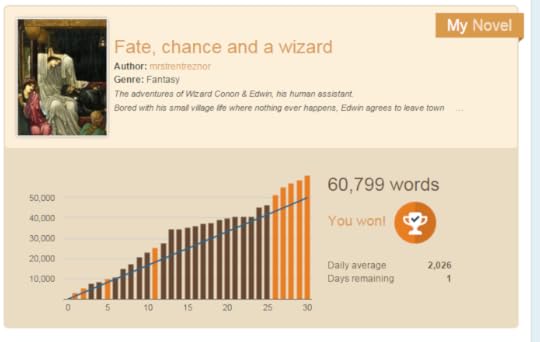 I got three different word counts in Word, Scrivener and Drive. I can’t tell how they are different (and it’s quite a lot) so I have over written to cover it.My daily average was 2,026 words. I set my usual daily target at 2k anyway. But I did write a few other things this month; about another 20k. So it is a monthly total of over 80k.I changed the name of the story to ‘Fate, Chance and a Wizard’ but I am not entirely sure about that, either. Thinking of titles is fiendishly difficult without making something that is terminally boring or too much like someone else’s title.‘The Adventures of Edwin Ash and Conon’ - no‘Edwin Ash and the journey from crossroads to capital’ - no - it sounds like a travel diary‘Wizards, magic and boys, oh, my’ - NO - and there are girls as well.‘Paths that lead to home’ - no‘Have wizard; will travel’ - NO‘The affairs of Wizards’ - a snatch from Tolkien “Do not meddle in the affairs of Wizards, for they are subtle and quick to anger.” NOYou get the issue…There is an African proverb, ‘if you want to go fast, go alone. If you want to go far, go together.’ To cut it down the title might be, ‘To go far, go together’ I don’t mind that one and they do, indeed go far. In fact, all the way… hehe.‘To go far, go together’OR‘Fate, Chance and a Wizard’I am not sure that either title is easy to remember; the last thing you want is someone forgetting the name when they try to order it.Ah well, I will probably change it again, anyway.A large chunk of the story is written but there is still a lot of detail needed to be added. Rather than get bogged down in descriptions (I do prefer to write dialogue) I just pop two %% where I need to research or add more. It is very easy to search for that symbol later.There is still a lot more story to tell and I really like my characters, Edwin Ash the inquisitive boy, and Conon the wizard who has travelled alone for too long. Edwin drags him into adventures by asking questions, touching things he shouldn't and demanding that they help people who are in trouble. And he makes Conon nuts.“Somebody should do something and we are somebody,” says Edwin.He’s so sweet. And eventually my surly wizard falls in love with him. Just like me.And then, it all changes when… but you will just have to read it.When it’s finished, of course!