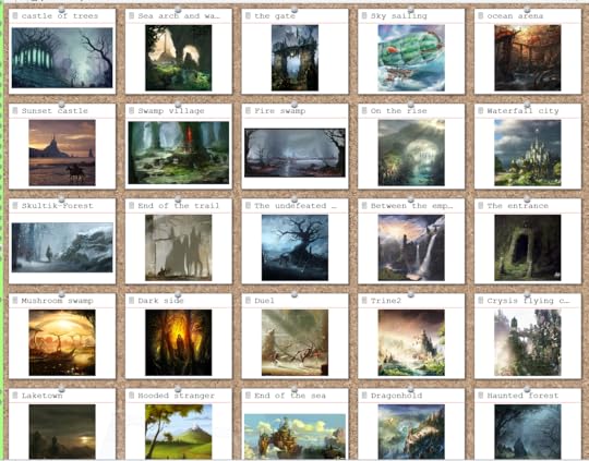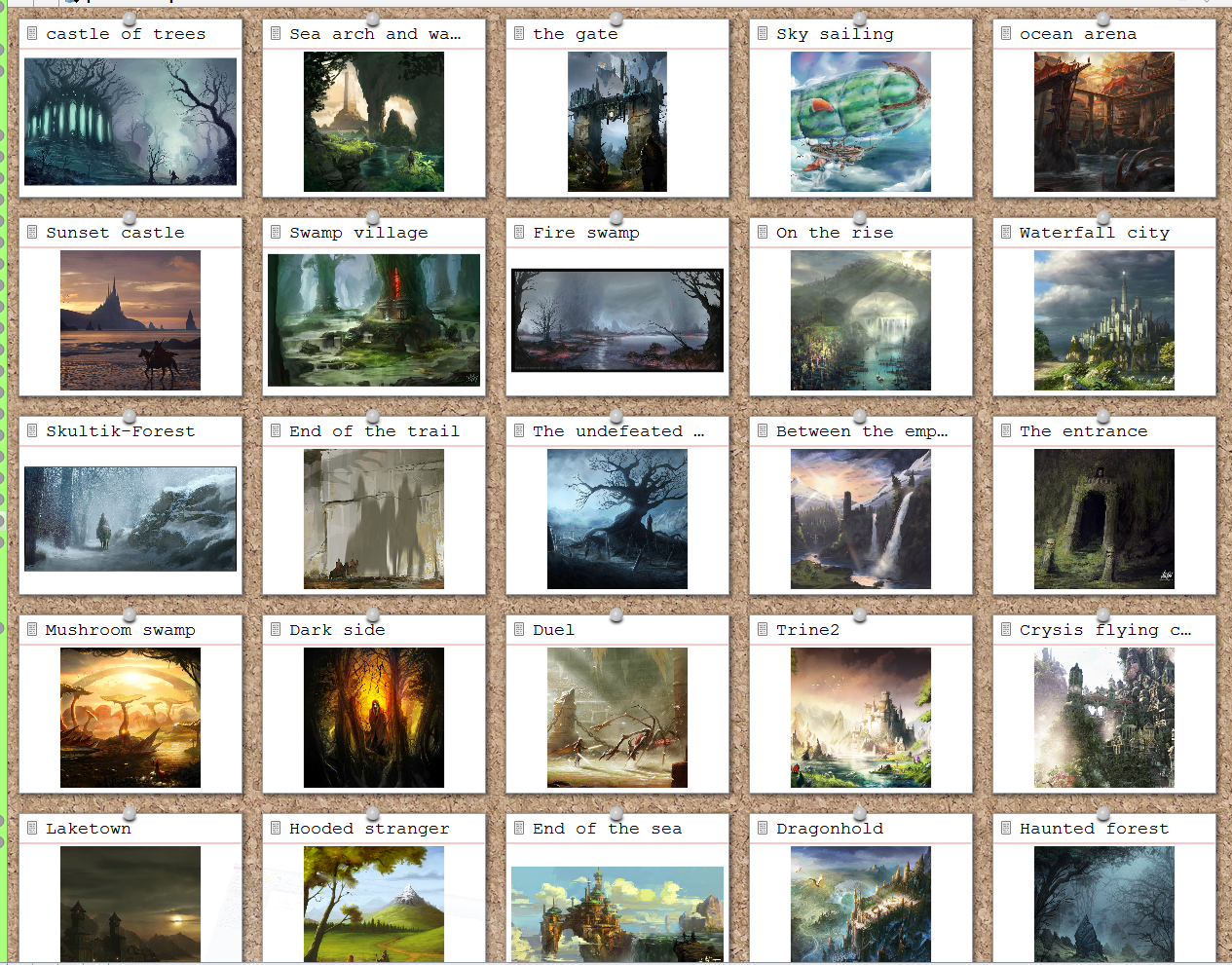 Yes, I have decided to do nanowrimo again. Buddy me up here if you wish.I completed it last year and then did nothing with my 50+k words. Sigh… *smacks self in head*This year, I am extending a short story. Snorts. When has she ever done that before? The story was the castle of trees one posted on the blog, here. It featured a wizard and his human assistant. I liked them and it seemed to have real potential to be extended. A week later, I saw another prompt that made me think of writing it for those two characters.I do a lot of writing prompts from Writeworld, and the fantasy ones always seem to be an expansive background shot with one or two small figures in the foreground. I got the idea that to do nanowrimo, I could pretty much write a short story for every fantasy looking prompt that would fit. Voila! Fifty thousand words!So I went through my Drive file of picture prompts and found, not thirty or so of them (one for each day x1600 words makes 50k), but forty six of them! Too easy. So my Scrivener corkboard looks like this.