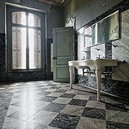 Picture Source: zerberuz.deviantart.comhttp://writeworld.tumblr.com/post/980... his eyelids apart he looked blearily around. Moving his head hurt. Weird... everything was in black and white... oh, wait... it was just this room. He waved his own hand in front of his face and it looked pale but still pinkish. Situation normal. It was just this room that was all muted shades of grey.The light coming through the open shutters made his head hurt, too.Party... had he been to a party? He couldn’t remember. He must have had a really good time.“Ugh,” he groaned. His back hurt and he shifted painfully. It was leaning on something hard and cold; the bath. No wonder; he had been asleep in the bath. Weren’t there any beds in this house?Was it a party? Was it in this house? Who’s house was it? That was weird. He didn’t remember coming here, let alone how he ended up asleep in the bath. Tacky, dry mouth made him look longingly at the taps. When he sat up he nearly fell down again. Ugh. Sharp pain in his head. That hurt. And his left arm was hard to lift and useless. He peered at it myopically. It was manacled. A large, metal band went around his wrist and -- he glanced over the edge of the bath to the floor-- and it was bolted to the tiled floor. What the Hell? He spent too long waving around that hand and still not being able to comprehend it.He tried to speak but his mouth clicked with thirst. He shuffled down the bath and worked at the tap. It wouldn’t turn.Maybe just as well. When he thought about it, if he had turned it on he would have worn the water rather than drunk it, still sitting in the bath. He eyed off the basins against the wall. He clambered out and clanked over to try one and got some rusty water out of it. It ran clear after a while giving him the impression that it had not been used for some time. The shelf above the sinks was missing. The brackets remained.Now, his thirst quenched, he noticed the paint peeling from the walls.The house was clearly abandoned... but why? Why was he here? Why couldn’t he remember? And why was he chained up?And then he heard the front door open... ~~~~© AM Gray 2014