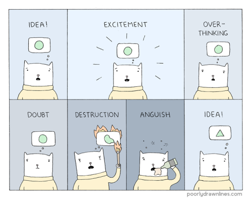 I saw a comic this week that so neatly encapsulated my works in progress (WIP) problem that I copied it here. And I checked the site and it is okay if you credit them. So thanks, poorly drawn lines… THAT is my problem.