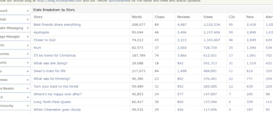 Some time ago, I realised that my fanfiction stats were fast approaching a huge milestone.And then I kind of forgot about it. I set a reminder in google keep with an alarm date on it, but obviously my math skills are deficient, and I was days late. I suspect I also forgot some of the more recent stories I had posted. They weren’t in the table and skewed the total in Excel.Today, I was tooling about and thought I’d just check because the daily read rates were higher than they have been for a while, and voila… my legacy story stats total is 10,032,027 hits.Whoa.