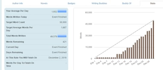Nanowrimo 2016.Well, that was a trip.Here is my chart for 2016. I missed the midnight cut off by 421 words.