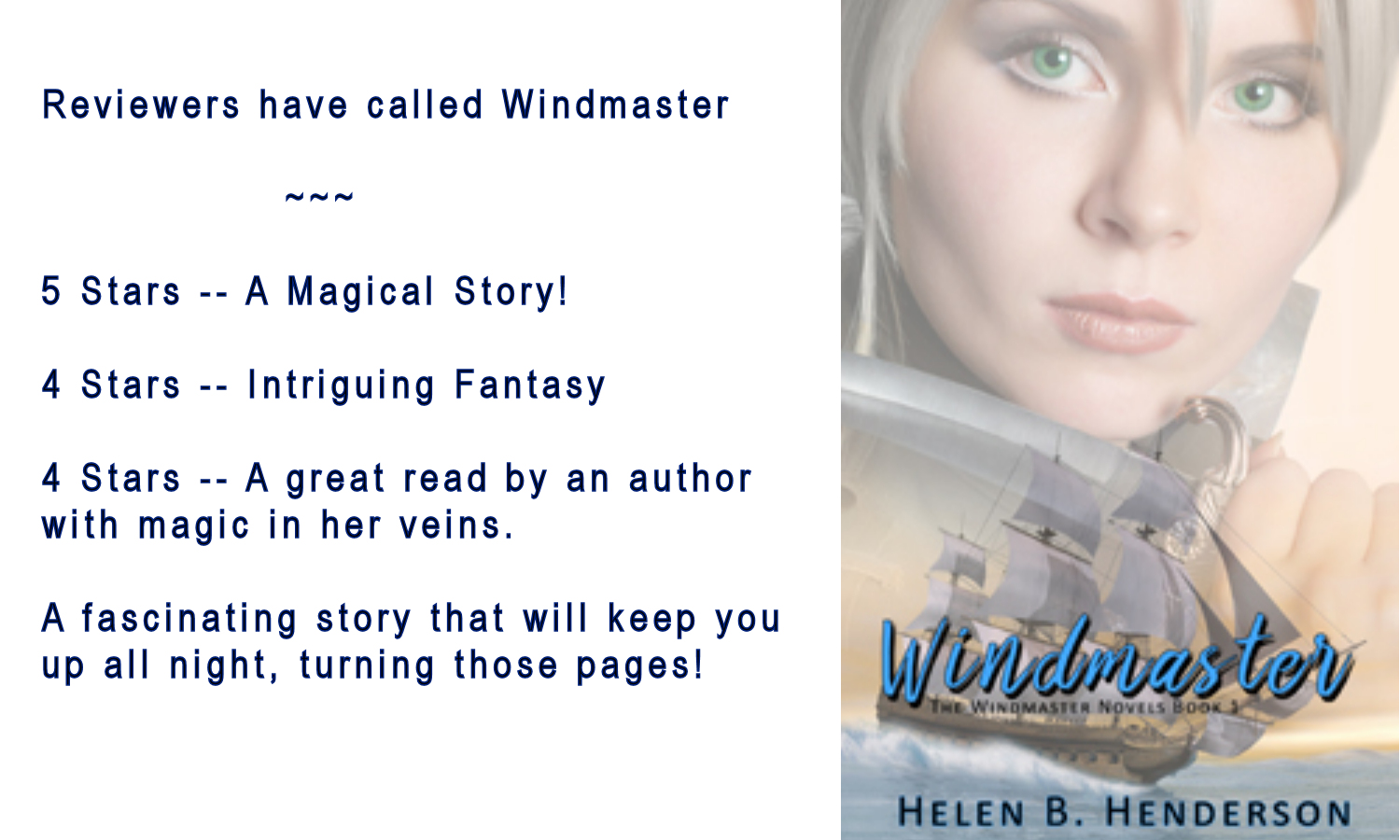 If you want to set sail for love and adventure, Windmaster is still on sale at Smashwords for 99 cents. Sale ends with the weekend. Excerpts can be found by clicking on the cover at the top of the page. ~till next time, Helen